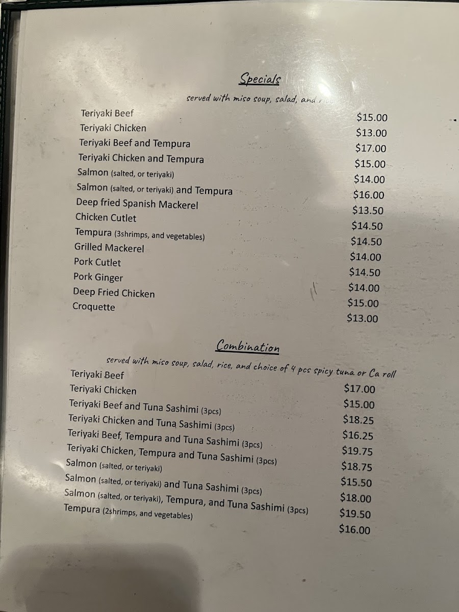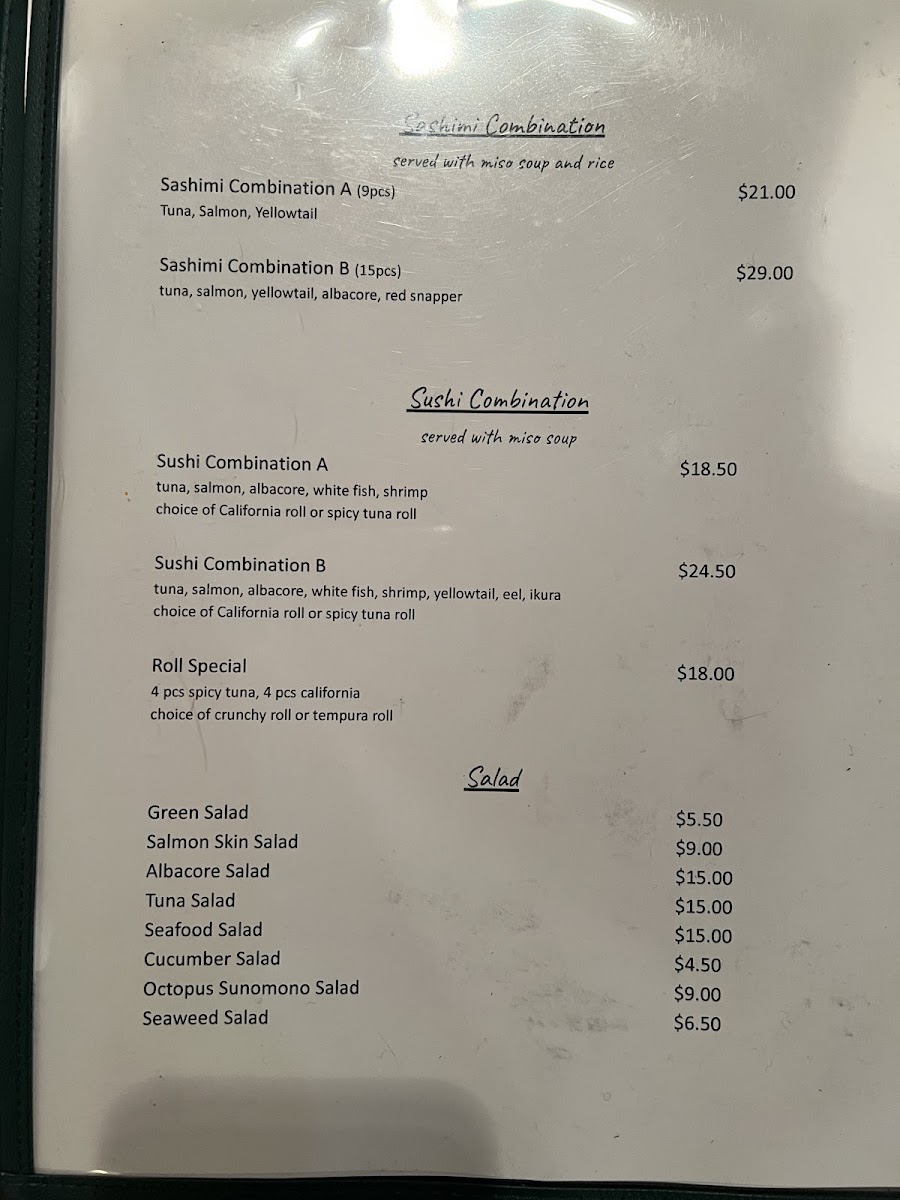 15 pieces. Tuna, salmon, yellowtail, albacore, red napper. Served with miso soup and steam rice.